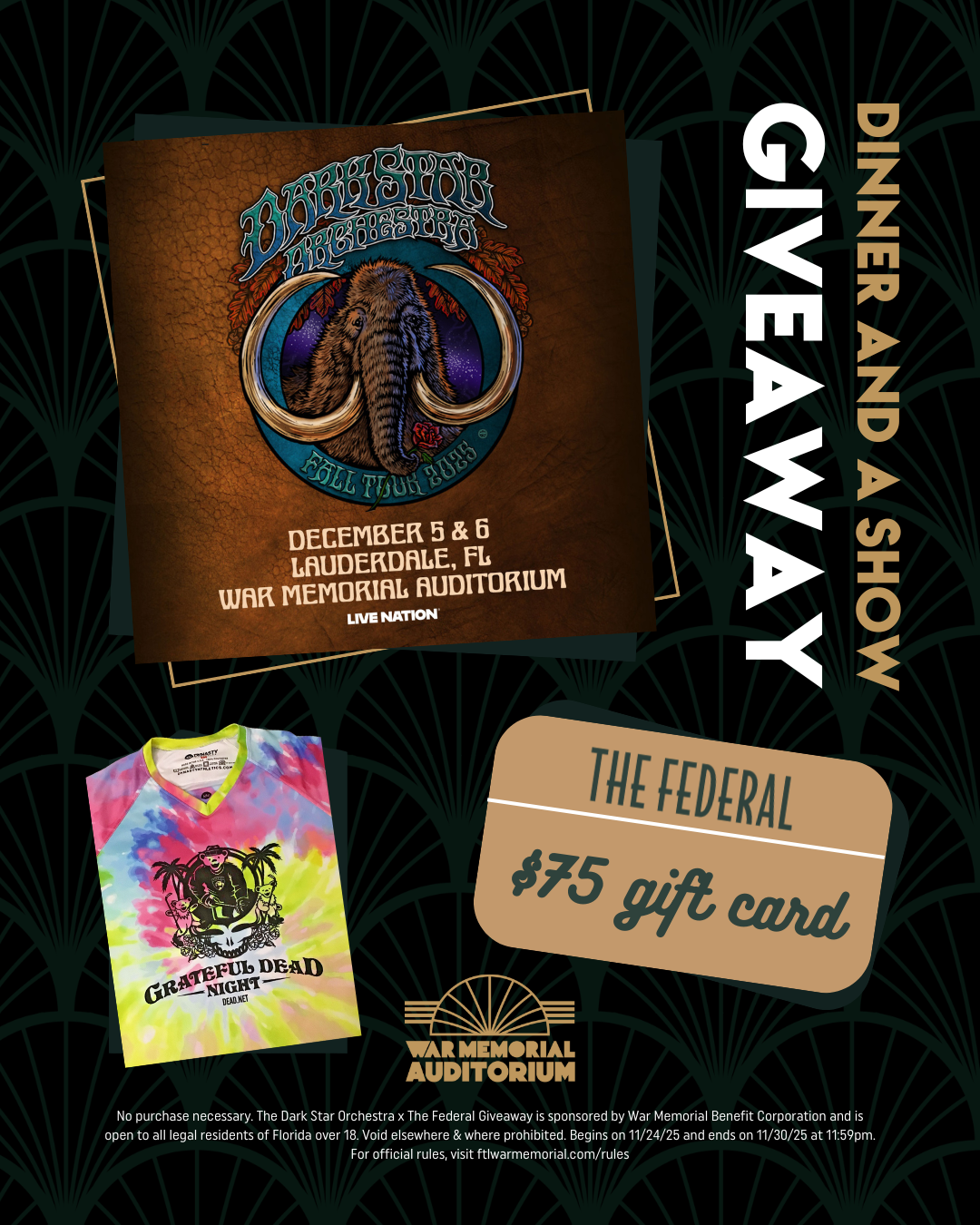 This season of giving, we’re giving away two tickets to see Dark Star Orchestra at War Memorial Auditorium on December 5 or 6, a limited edition Florida Panthers x Grateful Dead jersey, and a $75 gift card to The Federal to enjoy a meal before or after the show! Enter to win over on our Instagram.